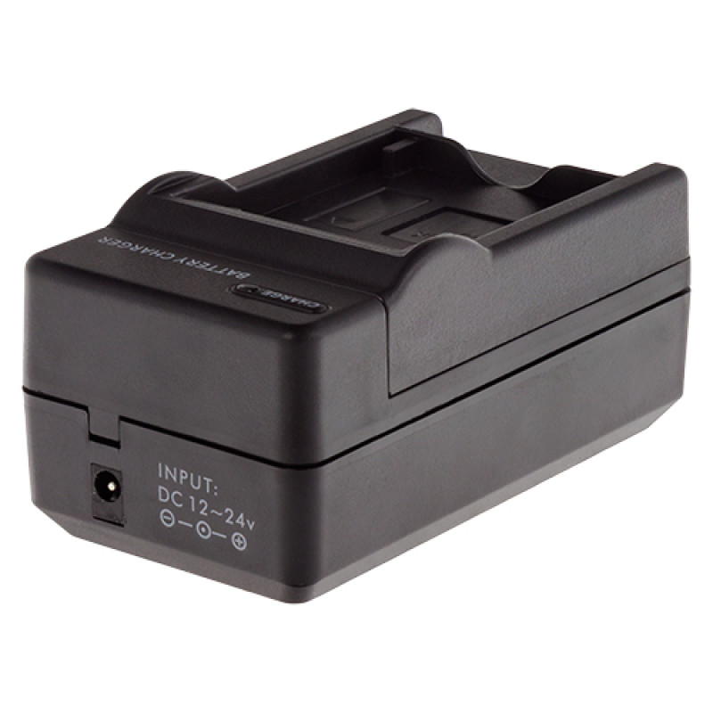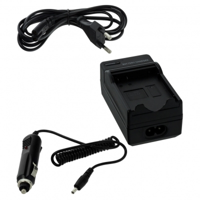 Kompaktná stolová nabíjačka na nabíjanie batérií pre fotoaparáty/kamery, ktorú možno zapojiť do bežnej elektrickej zásuvky alebo do zásuvky v aute. LED indikátor stavu zobrazuje stav nabitia batérie. Keď je batéria plná, nabíjačka sa automaticky vypne.